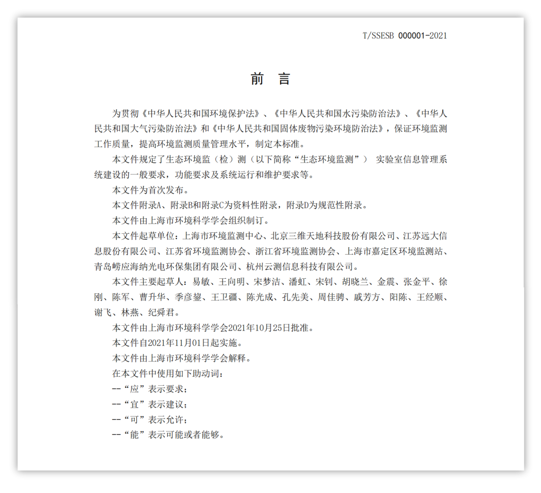 10月25日,由上海市環(huán)境監(jiān)測中心、北京三維天地科技股份有限公司及江蘇、浙江省環(huán)境監(jiān)測協(xié)會等八家單位共同起草的《生態(tài)環(huán)境監(jiān)測實(shí)驗(yàn)室信息管理系統(tǒng)建設(shè)技術(shù)指南》,經(jīng)上海市環(huán)境科學(xué)學(xué)會批準(zhǔn),將于2021年11月01日起正式實(shí)施。