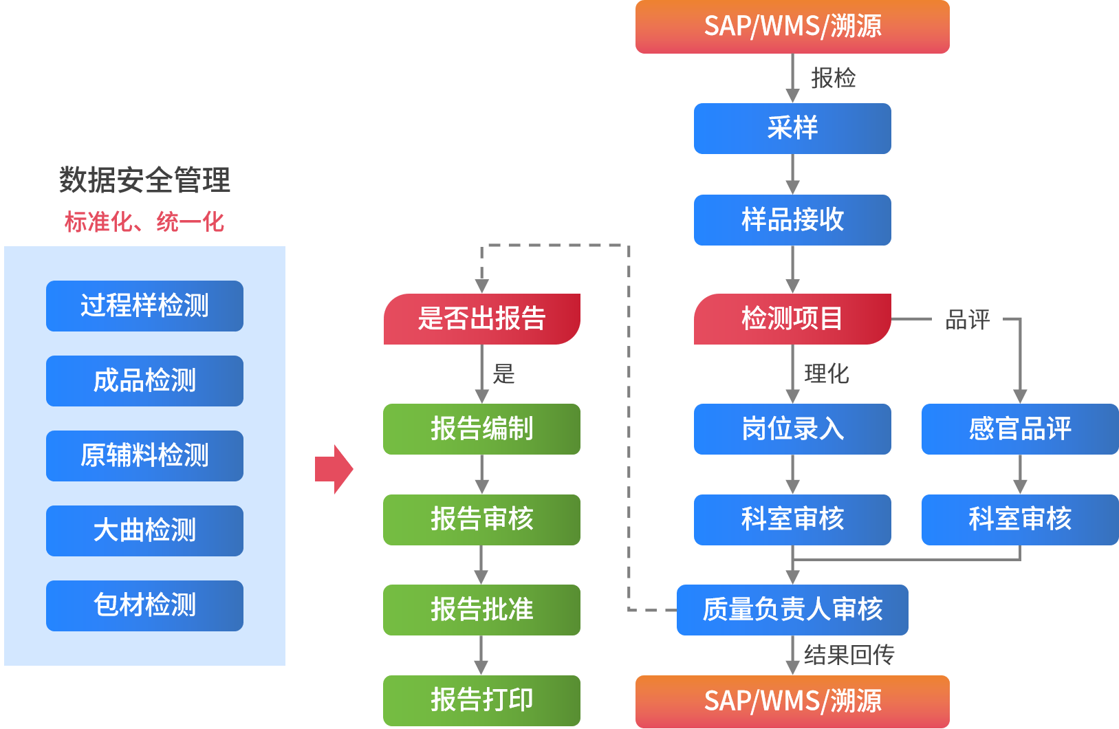 對(duì)于白酒企業(yè)而言,質(zhì)量檢測(cè)部門肩負(fù)著企業(yè)眾多檢測(cè)任務(wù),涵蓋從研發(fā)、生產(chǎn)到產(chǎn)品出廠的各個(gè)階段,而LIMS系統(tǒng)在這些環(huán)節(jié)中扮演著至關(guān)重要的角色。LIMS系統(tǒng)不僅能夠管理新產(chǎn)品研發(fā)過程中的檢驗(yàn)工作,還能夠處理包括原料進(jìn)廠、生產(chǎn)過程中的產(chǎn)品、最終出廠的成品以及所有相關(guān)生產(chǎn)材料的檢測(cè)信息。