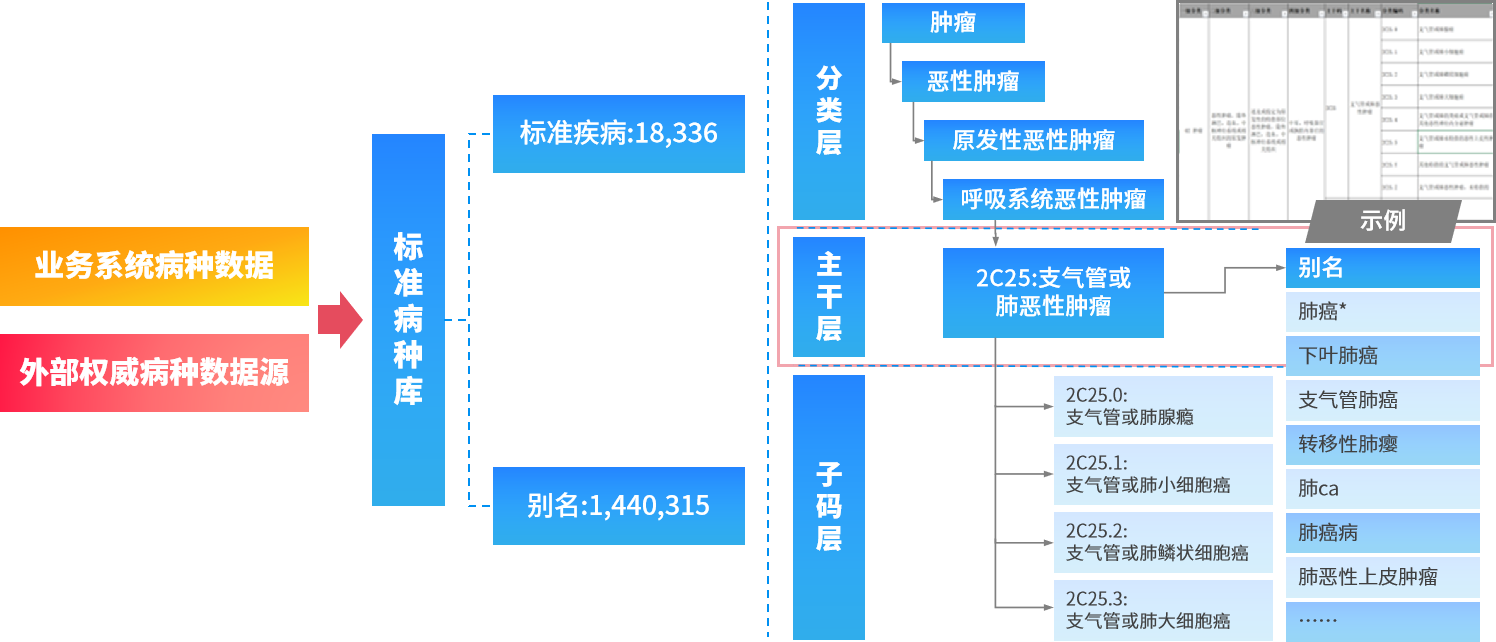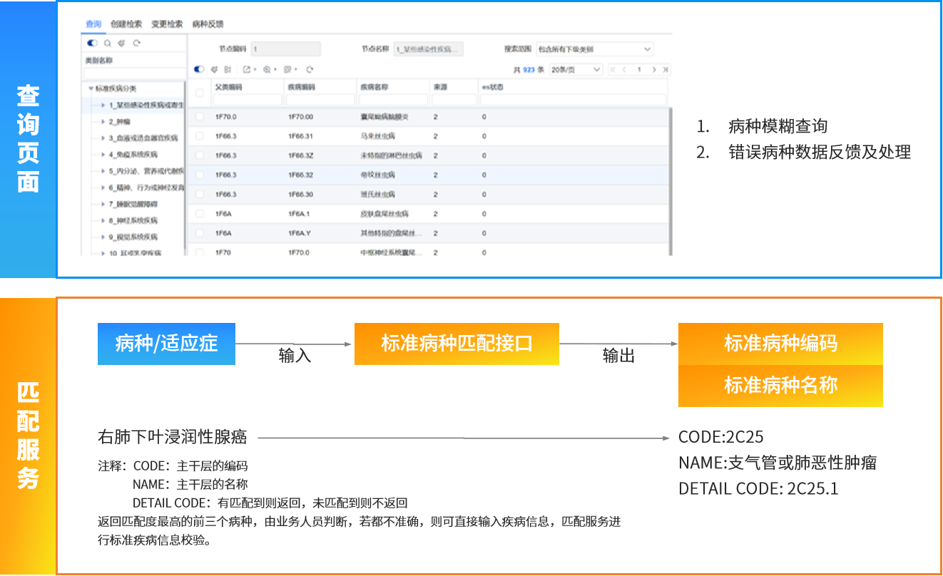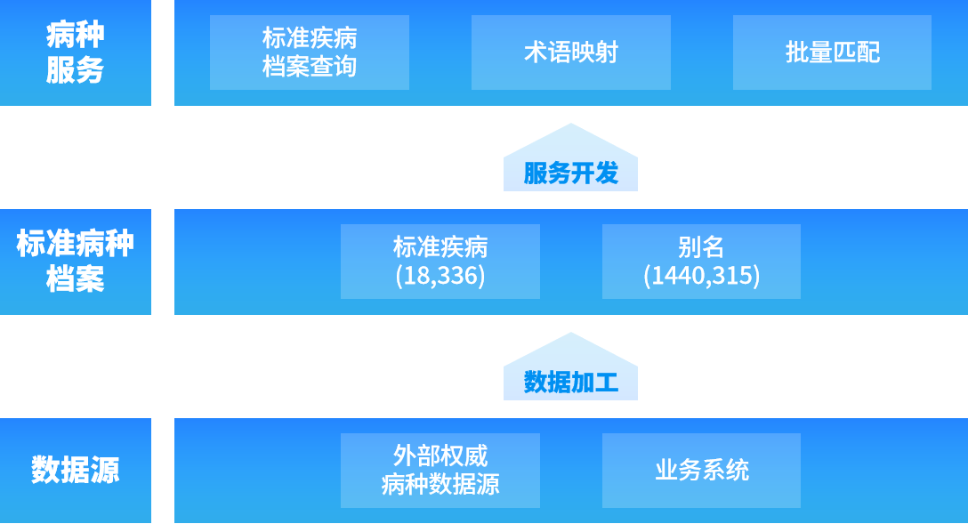 沒有統(tǒng)一標準的病種數(shù)據(jù),導致的核心問題主要為基于病種開展的相關數(shù)據(jù)分析復雜且不準確,分析人員需要將多種不規(guī)范的病種描述轉譯成統(tǒng)一名稱開展數(shù)據(jù)分析,從而導致分析工作的時間周期長及分析不準確的問題,因此疾病分類主數(shù)據(jù)建設的主要目標為建立標準的疾病分類檔案庫,并可提供便捷的匹配服務,以便更好地支持基于病種進行用戶數(shù)據(jù)分析,以及后續(xù)開展病種知識庫建設形成病種知識庫建設的數(shù)據(jù)基礎。