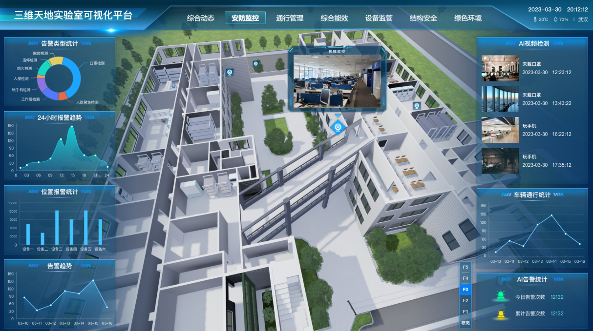 - 智慧安防感知監(jiān)管:智慧孿生平臺(tái)直接獲取門禁出入記錄及視頻監(jiān)控信息。融合計(jì)算機(jī)視覺與前沿AI算法,創(chuàng)新采用“數(shù)字孿生+實(shí)時(shí)視頻”雙通道監(jiān)控模式。系統(tǒng)智能識(shí)別實(shí)驗(yàn)室內(nèi)人員操作行為,對違規(guī)動(dòng)作(如不規(guī)范操作、危險(xiǎn)行為)進(jìn)行即時(shí)分析與預(yù)警,構(gòu)筑智能化主動(dòng)安全防護(hù)體系。
