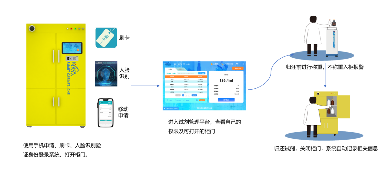 - 危化品智能管控,安全精準(zhǔn)無憂:創(chuàng)新集成智能試劑柜、RFID標(biāo)簽及人臉識(shí)別技術(shù),構(gòu)建?;罚ㄈ缫字贫?、易爆品)智能安全管理閉環(huán)。系統(tǒng)自動(dòng)校驗(yàn)實(shí)驗(yàn)人員試劑領(lǐng)取權(quán)限,實(shí)時(shí)智能核減庫存量,并實(shí)現(xiàn)耗材快速定位與自動(dòng)化盤點(diǎn),安全與效率雙提升。