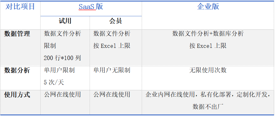 SaaS版和企業(yè)版產品對比如下: