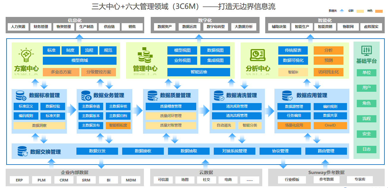 北京三維基于在主數(shù)據(jù)管理領(lǐng)域深耕細(xì)作,整合為眾多特大型央企和集團(tuán)型企業(yè)的項(xiàng)目建設(shè)經(jīng)驗(yàn),融合了數(shù)據(jù)標(biāo)準(zhǔn)管理、數(shù)據(jù)生命周期管理、數(shù)據(jù)交換管理、數(shù)據(jù)質(zhì)量管理、數(shù)據(jù)清洗管理、數(shù)據(jù)應(yīng)用管理六大模塊,方案中心、分析中心、管理中心三大中心以及Mobile移動辦公,打造3C6M—體化主數(shù)據(jù)管理解決方案,為客戶提供從標(biāo)準(zhǔn)建立、數(shù)據(jù)質(zhì)量管控、數(shù)據(jù)交換應(yīng)用、數(shù)據(jù)治理,到企業(yè)數(shù)據(jù)方案中心建設(shè)、數(shù)據(jù)場景化的深入應(yīng)用、智能化數(shù)據(jù)管理、智能化運(yùn)維等全面的管控、洞察、應(yīng)用一體化解決方案,為企業(yè)數(shù)據(jù)標(biāo)準(zhǔn)化建設(shè)、數(shù)據(jù)治理提供強(qiáng)大支持,助力企業(yè)實(shí)現(xiàn)無邊界信息流。